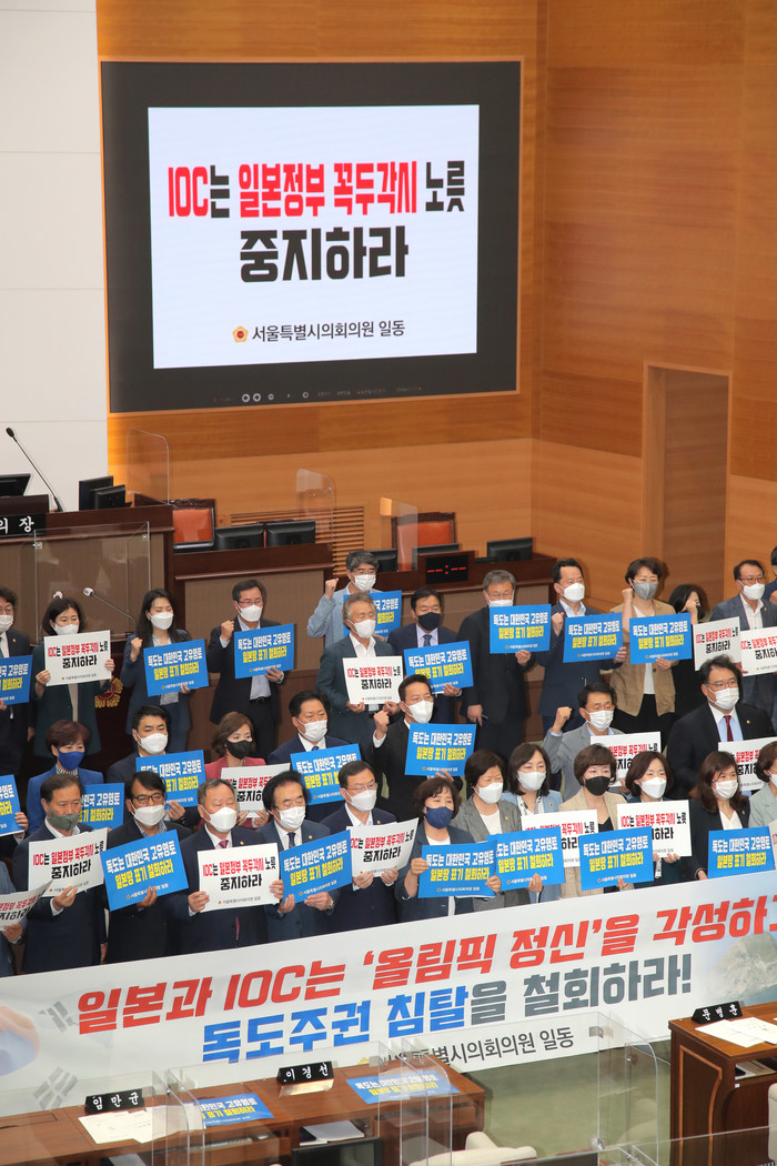 15일 오후 서울시의회 정례회 본회의를 마친 의원들이 도쿄올림픽조직위 홈페이지 독도 표기와 관련해 규탄대회를 열고 있다. 서울시의회는 이날 일본의 독도 영유권 침탈행위 규탄 결의안을 채택했다.