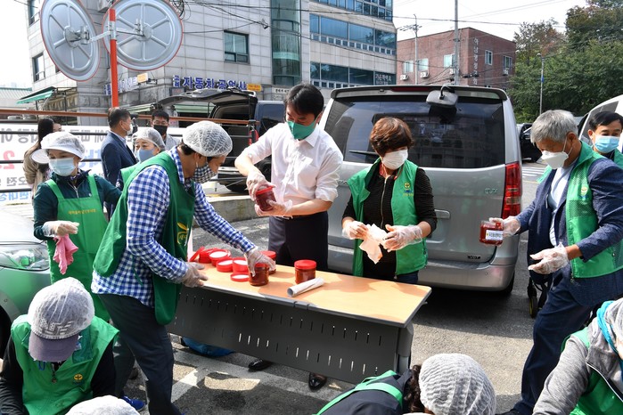 새마을운동 하남시지회가 12일 경기 하남시 지역내 홀몸노인, 소년소녀가장 등 취약계층 400가구에 고추장을 직접 만들어 전달하는 '우리동네 행복밥상' 사업을 진행했다. 사진은 이날 행사에 참석한 김상호 시장(가운데)이 고추장을 포장하고 있는 모습. (사진제공=하남시청)