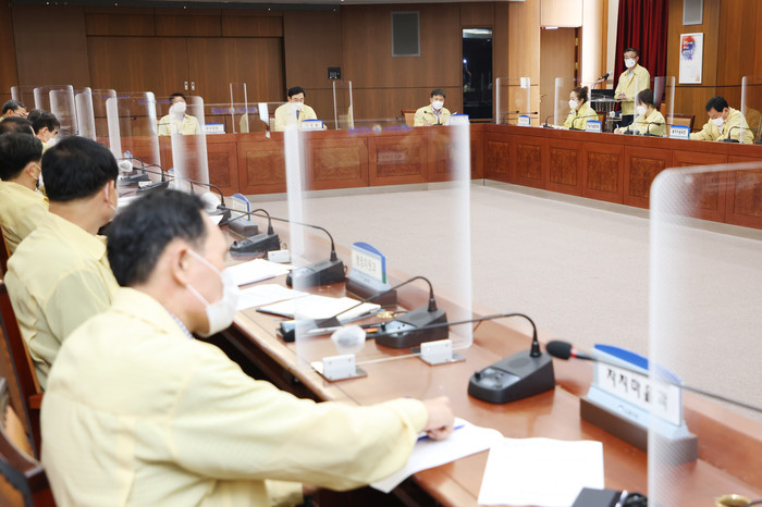 이동진 서울 도봉구청장이 지난 9일 ‘코로나19 수도권 확산 관련 긴급 대책 회의’를 진행했다. 회의에서 이 구청장은 도봉구 확진자 발생 추이와 관리 현황에 대해 보고받고, 4단계 격상에 따른 창동역 1번 출구 고가하부 광장의 추가 임시선별검사소 설치 등 조치사항을 점검했다. 사진은 이 구청장(가운데)이 회의를 주재하고 있는 모습. (사진제공=도봉구청)
