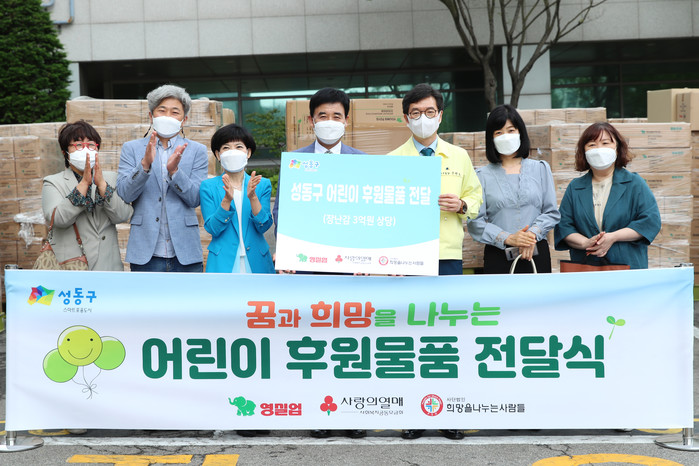 서울 성동구는 25일 (사)희망을나누는사람들로부터 장난감 전문업체인 영실업에서 기부받은 어린이 장난감 11톤을 전달받았다. 이 장난감은 지역내 어린이집·아동복지시설 등 9개 기관 177곳 기관의 아동들에게 전달됐다. 사진은 전달식에서 정원오 구청장(오른쪽 세 번째)과 관계자들이 기념촬영을 하는 모습. (사진제공=성동구청)