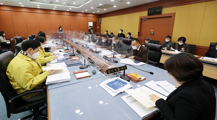 최근 충남 서산시의회가 의회 간담회장에서 의원 정책간담회를 열고, ▲조례안 11건 ▲안건사전설명 5건 ▲현안보고 8건 ▲기타협의 6건 등 30개 안건을 사전 확인했다. 사진은 조례안을 검토중인 의원들과 관계자들의 모습. (사진제공=서산시의회)