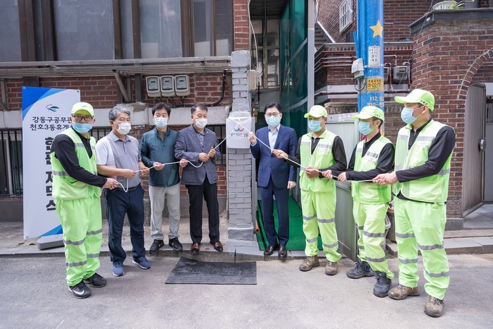서울 강동구는 19일 환경미화원 천호3동휴게실을 임시 이전하고 현판 제막식을 개최했다. 천호3동 주민센터 노후공공청사 건축공사로 인해 공사기간 인근 단독주택에 임시 휴게실을 마련했다. 사진은 현판 제막식에 참석한 이정훈 구청장(오른쪽에서 네 번째)이 관계자들과 기념촬영을 하고 있는 모습. (사진제공=강동구청)