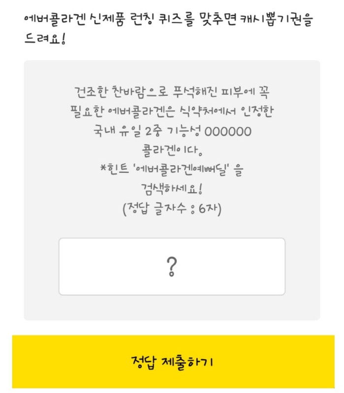 14일 출제된 '에버콜라겐예뻐딜' 카카오페이지 퀴즈는 "건조한 찬바람으로 푸석해진 피부에 꼭 필요한 에버콜라겐은 식약처에서 인정한 국내 유일 2중 기능성 ○○○○○○ 콜라겐이다"에서 빈 칸을 채우는 문제다.