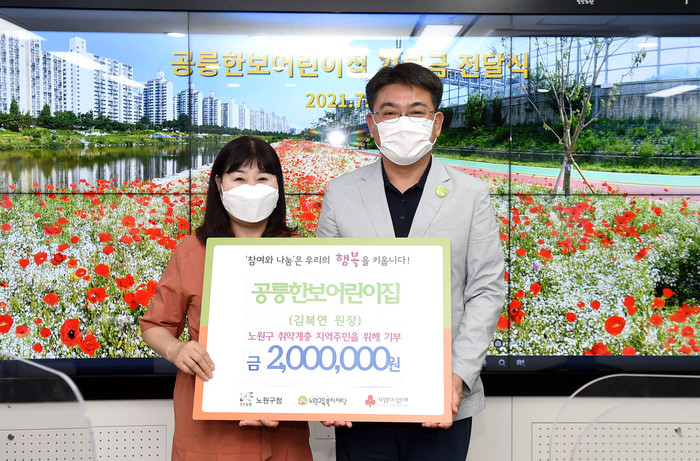 서울 노원구는 최근 공릉2동에 위치한 공릉한보어린이집으로부터 폭염 및 코로나19 장기화로 어려움을 겪고 있는 이웃을 위한 성금 200만원을 전달받았다. 사진은 전달식에서 오승록 구청장(오른쪽)과 관계자가 기념촬영을 하는 모습. (사진제공=노원구청)