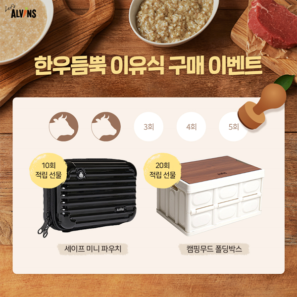 한우듬뿍 이유식 구매 이벤트는 엘빈즈 공식몰에서 한우듬뿍 이유식 세트 구매 시 참여가 가능하며, 스탬프 적립 달성 시 감성 캠핑용품을 받을 수 있다. 엘빈즈 감성 캠핑용품은 10회 스탬프 달성 시 작은 유아용품 보관이 가능한 하드케이스 세이프 미니 파우치를, 20회 적립 시 야외에서는 간단한 테이블로 실내에서는 수납박스로 사용 가능한 캠핑무드 폴딩박스를 받을 수 있다.