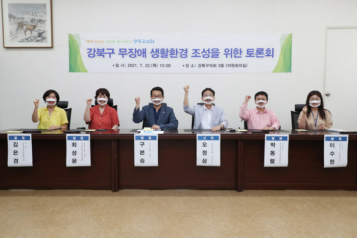 오정삼 삼양주민연대 사무국장이 토론회 사회를 봤으며, 발표자로는 '강북구 무장애 생활환경 조성 필요성' 주제로 김은경 강북장애인종합복지관 과장이, '민간부문 무장애시설 개선지원 필요성과 방안제안' 주제로 박동렬 강북장애인자립생활센터 사무국장이, '의사소통약자의 정보접근성 및 소통 개선지원 필요성과 방안제안' 주제로 최성윤 서울특별시농아인협회 강북구지회 과장이, '주거약자 무장애 주거편의시설 개선지원 필요성과 방안제안' 주제로 구본승 구의회 의원이, '강북구청의 무장애 생활환경 조성 계획' 주제로 이수현 강북구청 생활보장과 주무관이 참석했다.