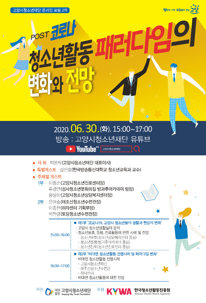 이번 온라인 포럼은 고양시청소년재단 박윤희 대표이사의 사회와 특별게스트로 김진호 한국방송통신대학교 교수 그리고 보호·복지·진로 등 각 분야의 전문성 높은 청소년지도사들과 함께 토론함으로써 포럼의 의미를 더할 것이며, 코로나19 생활 속 거리두기를 준수하여 고양시청소년재단 공식 유튜브로 실시간 중계된다.