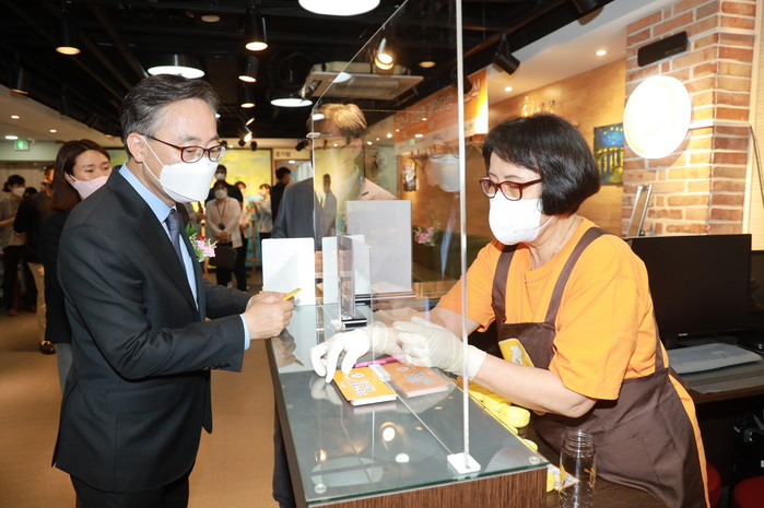 서울 금천구는 최근 금천구치매안심센터 내 고정형 기억다방 개소식을 개최했다. ‘기억다방’은 경증 치매 또는 경도인지장애 진단을 받은 노인이 바리스타로 참여하는 카페로, 기억을 지키는 다양한 방법이라는 의미를 담고 있다. 사진은 유성훈 구청장(왼쪽)이 금천구치매안심센터 고정형 기억다방에서 커피를 주문하고 있는 모습. (사진제공=금천구청)