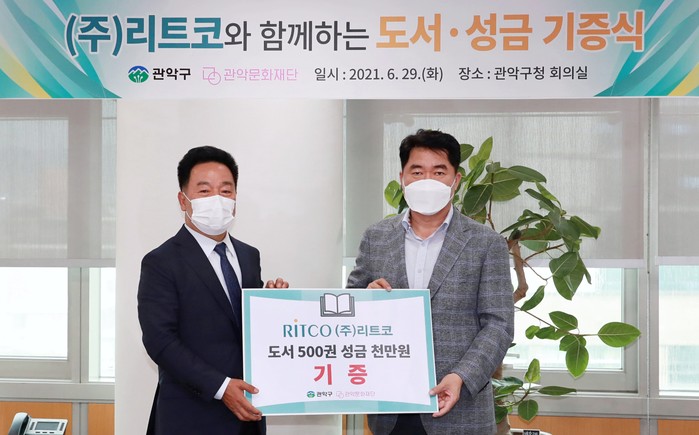 서울 관악구가 29일 종합솔루션 업체 ‘(주)리트코’로부터 역사 만화도서 500권과 불우이웃돕기 성금 1000만원을 기부받았다. 성금은 복지시설을 통해 지역내 어려운 청소년·노인들에게 지원될 예정이며, 기증받은 도서 <대한민국 영토 독도>는 지역내 도서관에 비치된다. 사진은 전달식에서 박준희 구청장(오른쪽)과 관계자가 기념촬영을 하는 모습. (사진제공=관악구청)