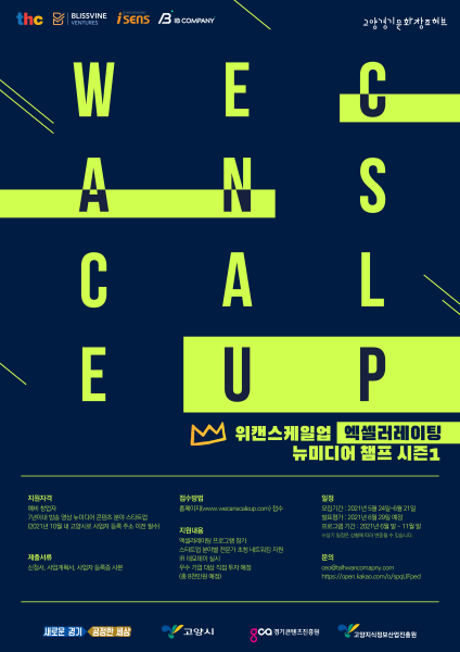 [고양=이기홍 기자] 고양시, 고양지식정보산업진흥원에서 운영하는 고양 경기문화창조허브에서 오는 6월 21일까지 “2021 뉴미디어 챔프 시즌1 『위캔스케일업 엑셀러레이팅』”에 참가할 스타트업을 모집한다.