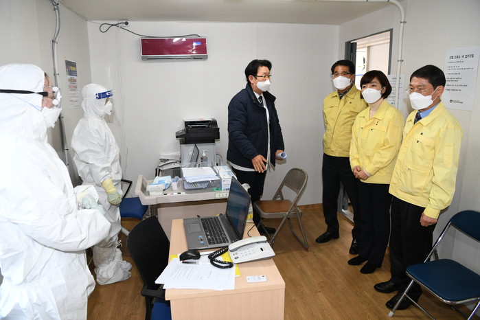 경남도의회 김지수 의장과 의원들은 최근 신종 코로나바이러스 감염증 차단에 나선 '경남도 재난안전대책본부'와 마산의료원을 방문해 관계자들을 격려했다. 사진은 재대본 회의에 참여한 의원들의 모습. (사진제공=경남도의회)
