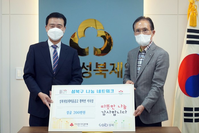 서울 성북구는 지난 27일 성북구 길음1동에 위치한 성북제일새마을금고로부터 지역 취약계층을 위한 코로나19 극복 희망성금 200만원을 기탁받았다. 사진은 전달식에서 이승로 구청장(왼쪽)과 관계자가 기념촬영을 하는 모습. (사진제공=성북구청)
