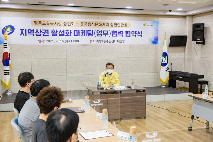 서울 광진구 자양4동 영동교골목시장 상인회와 중국음식문화거리 상인연합회는 16일 ‘지역상권 활성화 마케팅 협력 협약식’을 개최했다. 두 상인회는 지역상권 활성화를 위한 협력사업을 발굴하고 공동 마케팅을 추진하기로 했다. 사진은 협약식에서 김선갑 구청장(오른쪽)이 축하인사를 하고 있는 모습. (사진제공=광진구청)