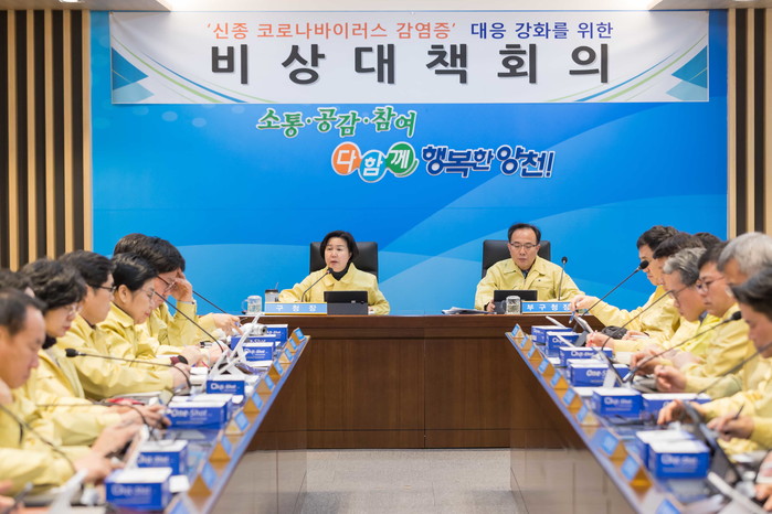 최근 김수영 서울 양천구청장이 구청 4층 공감기획실에서 ‘신종 코로나바이러스 감염증’ 확산을 대비한 비상대책회의를 열고 보건소 비상 대응체계반 구축, 지역내 주요 시설 주기적 방역 실시 등의 향후 계획을 논의했다. 사진은 회의 진행 모습. (사진제공=양천구청)