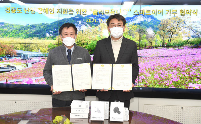 서울 노원구가 25일 (주)올리브유니온으로부터 경중도 난청 장애인 지원을 위한 난청용 음성증폭기 ‘올리브 스마트 이어’ 10대(300만원)를 기증받고, 사용법 안내 등 사후관리를 지원하기 위한 협약식을 열었다. 사진은 오승록 구청장(오른쪽)이 기부 협약 체결 후 관계자와 기념촬영을 하는 모습. (사진제공=노원구청)