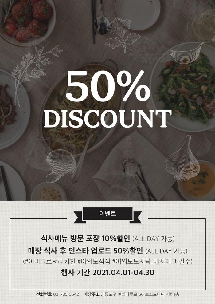 먼저 여의도 포스트타워 지하 1층에 위치한 이미 그로서리 키친 매장에서 식사 후 본인 인스타그램에 관련 포스팅을 업로드 하면 식사 메뉴의 50%를 할인해준다. 포스팅 시 ‘#이미그로서리키친’, ‘#여의도점심’, ‘#여의도도시락’ 총 3개의 해시태그를 기입하여 업로드하면 된다. 해당 할인율은 방문 시간대와 상관없이 그로서리 상품을 제외한 식사 전 메뉴에 적용되며 핫스톤치킨, LA갈비구이, 전복구이 등의 그릴 메뉴와 장어덮밥, 소불고기비빔밥, 차돌깍두기볶음밥 등의 식사 메뉴를 보다 저렴한 가격에 즐길 수 있다.