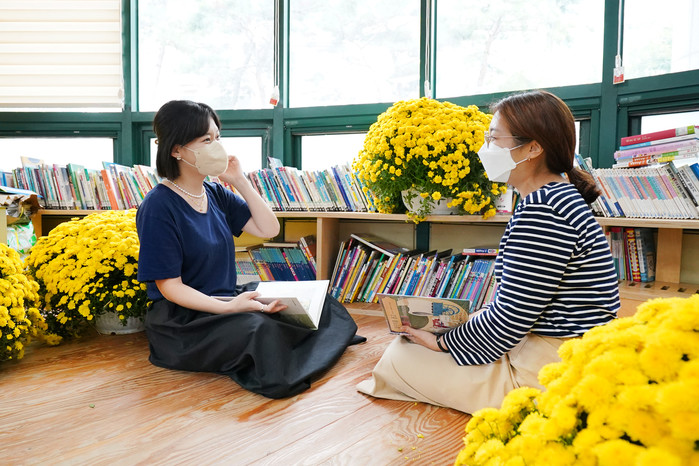 서울 동대문구 휘경2동 주민센터는 최근 허브뱅크유통(주) 양경옥 대표가 기증한 국화를 활용해 전농1동·휘경1동·휘경2동 주민센터 등을 꾸몄다. 사진은 화사한 국화로 꾸며진 주민센터 내 도서관에서 이야기를 나누고 있는 주민들의 모습. (사진제공=동대문구청)