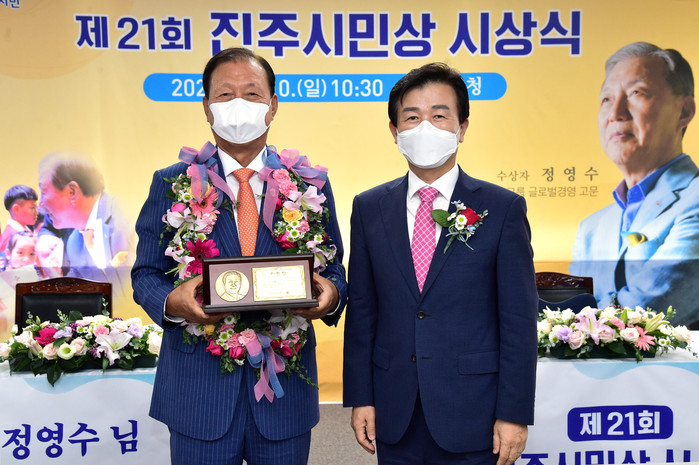 올해 진주시민상 수상자는 CJ그룹 글로벌 경영고문으로 재직하고 있는 정영수 씨(남, 76세)로, 현재 해외한인무역협회 상임고문, 세계한상대회 리딩 CEO, 세계한인언론인협회 총재, 세계한상대회 리딩 CEO포럼 공동의장 등으로 활동하고 있다.
