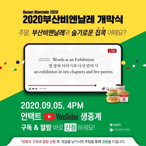 부산시(시장 권한대행 변성완)와 (사)부산비엔날레조직위원회(집행위원장 김성연)는 9월 5일부터 11월 8일까지 총 65일간 부산현대미술관과 원도심, 영도 일대에서 ‘2020 부산비엔날레’를 공동 개최한다고 밝혔다.