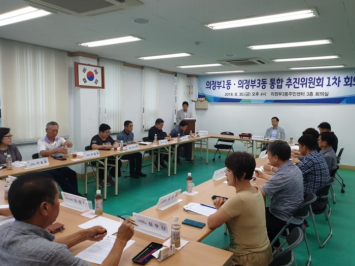 경기 의정부시는 최근 의정부3동 주민센터 3층 회의실에서 ‘의정부1·3동 통합추진위원회’ 1차 회의를 개최하고 위원장 선출 및 동 명칭을 결정했다. 이날 위원장 주재로 회의를 진행해 통합 동 명칭을 의정부1동으로 결정했다. 사진은 회의를 진행하는 모습. (사진제공=의정부시청)