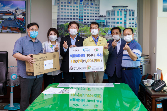 서울 동대문구는 최근 (사)한국신지식인협회와 (사)장애인생명문화협회로부터 폭염으로 힘든 취약계층을 위한 써큘레이터 104대(1000만원 상당)를 기탁받았다. 써큘레이터는 각 동으로 배부돼 냉방용품을 필요로 하는 취약계층에 전달될 예정이다. 사진은 전달식에서 최홍연 부구청장(오른쪽에서 세 번째)과 관계자들이 기념촬영을 하고 있는 모습. (사진제공=동대문구청)