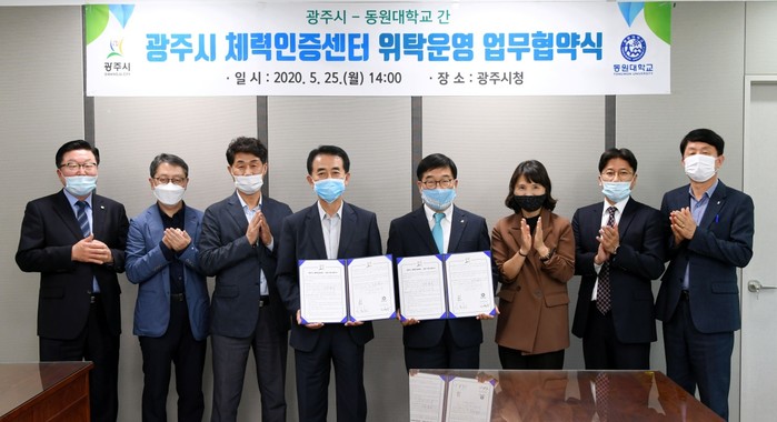 경기 광주시가 최근 동원대학교와 '광주시 체력인증센터 운영을 위한 위탁운영 협약'을 체결했다. 협약에 따라 동원대 교수로 구성된 건강관리 전문가 등이 센터를 운영하게 된다. 사진은 신동헌 시장(오른쪽 네 번째)이 관계자들과 기념촬영을 하는 모습. (사진제공=광주시청)