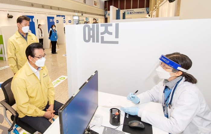 성장현 서울 용산구청장이 지난 5일 질병관리청 지침에 따라 코로나19 백신 예방접종센터에서 아스트라제네카(AZ) 백신을 맞았다. 사진은 성 구청장(가운데)이 접종 전 예진 중인 모습.(사진제공=용산구청)