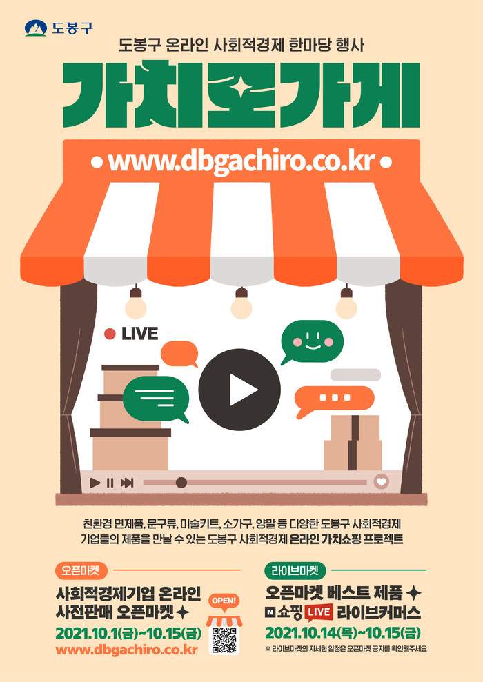 [시민일보 = 여영준 기자] 도봉구(구청장 이동진)는 사회적경제기업의 판로와 주민의 사회적경제 공감대를 넓히고자 '사회적경제 한마당 행사'를 오는 10월1~15일 2주간 온라인 오픈마켓과 라이브커머스를 통해 진행한다고 밝혔다.