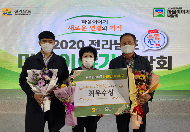 | ▲ 김송자 강진군 탑동마을 대표와 관계자들, "2020 전라남도 마을이야기 박람회" 최우수상 수상 기념촬영 / 강진군 제공 |
