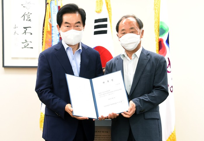 경기 의정부시는 2일 의정부시 발달장애인 평생교육지원센터장에 이경재씨를 임용하고 임용장을 수여했다. 발달장애인 평생교육지원센터는 권역별 평생학습센터로 지난 4월 리모델링해 오는 9월쯤 개소식을 할 예정이다. 사진은 임용식에서 안병용 시장(왼쪽)이 이경재 신임 센터장과 기념촬영을 하는 모습. (사진제공=의정부시청)