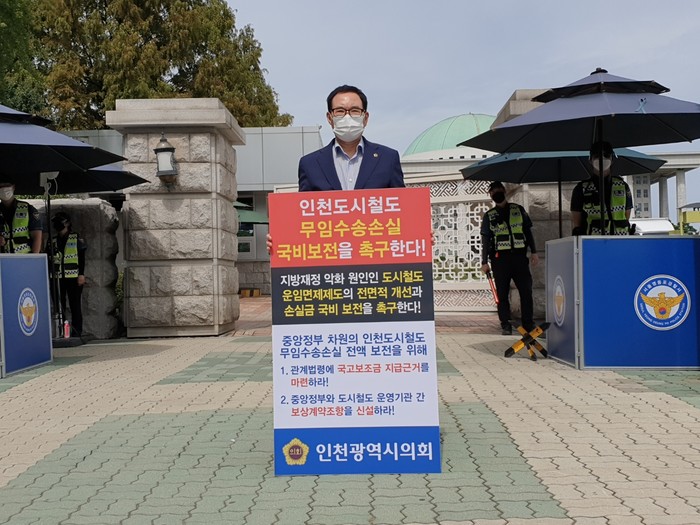 [인천=문찬식 기자] 이용범 인천시의회 의원(계양구 제3선거구)이 최근 지하철 무임승차 손실에 대해 정부 부담 검토를 요구하며 국회 1인 시위에 나섰다.