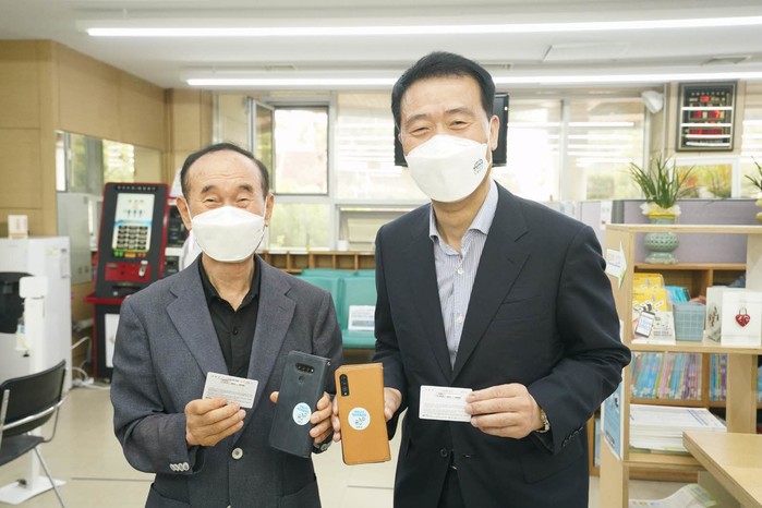 서울 성북구가 이달부터 코로나19 1·2차 백신 접종을 완료한 주민을 대상으로 백신접종 증명서와 스티커를 발급하고 있다. 지난 6월 코로나19 1차 접종을 받은 이승로 구청장이 7일 성북동 주민센터를 방문해 스티커를 발급받았다. 사진은 이날 이 구청장(오른쪽)이 동주민센터를 방문한 한 노인에게 스티커 발급·활용과 관련해 안내를 하고 있는 모습. (사진제공=성북구청)