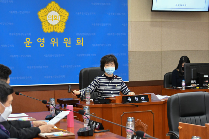 | ▲ 운영위원회가 코로나19 대응을 위해 임시회 일정을 나흘로 대폭 단축했다. 사진은 회의를 진행 중인 김광심 운영위원장. (사진제공=강남구의회) |