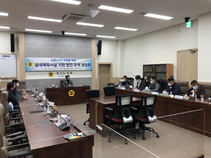황대호 경기도의원이 지난 8일 ‘코로나19 극복을 위한 실내체육시설업 지원 방안 모색 정담회’를 개최해 도내 실내체육시설들이 겪는 어려움을 청취하고 지원 방안을 모색하는 자리를 가졌다. 이날 정담회에는 한국 어린이수영시설협의회 서명석 회장, 필라테스·피트니스 사업자 연맹 박주형 회장, 한국 유소년 스포츠클럽협회 백성욱 회장, 경기도태권도협회 김평 국장, 수영장경영자협회 한주연 사무처장 등 도내 실내체육시설업종 대표들과 경기도청 이인용 체육과장, 기이도 체육행정팀장 등이 참석해 실내체육시설업종 위기 극복 지원에 대한 열띤 논의를 펼쳤다. 사진은 황 의원(가운데)이 참여자들과 회의하는 모습.(사진제공=경기도의회)