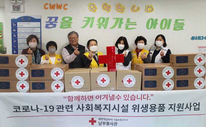 대한적십자사 서울시지사가 최근 코로나19 감염병 극복을 위해 서울시내 보육시설인 강남드림빌, 청운보육원, 상록보육원 등에 아동용 마스크, 성인용 마스크, 손소독제, 물티슈 등의 위생용품을 전달했다. 사진은 관계자들이 기념촬영을 하는 모습. (사진제공=대한적십자사 서울시지사)