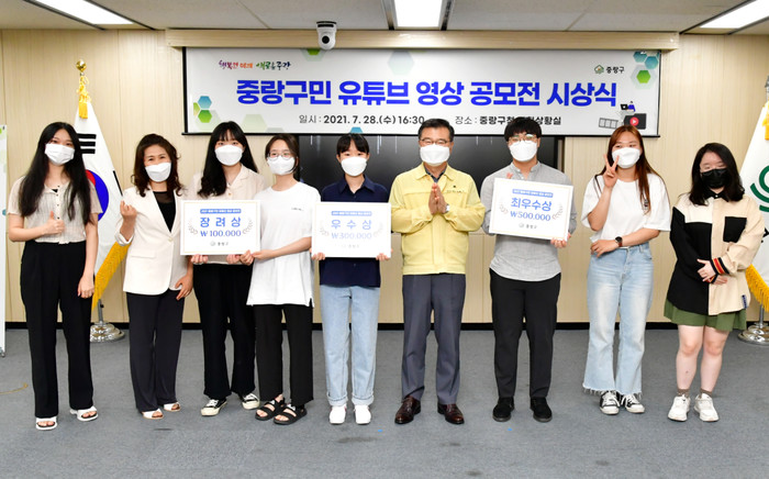 서울 중랑구는 지난 27일 중랑구민 유튜브 영상 공모전 시상식을 개최했다. 구는 지난 6월 ‘중랑의 행복한 변화’를 주제로 공모전을 개최해 영상을 접수받았고, 주민들이 제작한 영상 23편 중 8편을 수상작으로 최종 선정했다. 사진은 시상식에서 류경기 구청장(가운데)이 수상자들과 기념촬영을 하는 모습. (사진제공=중랑구청)