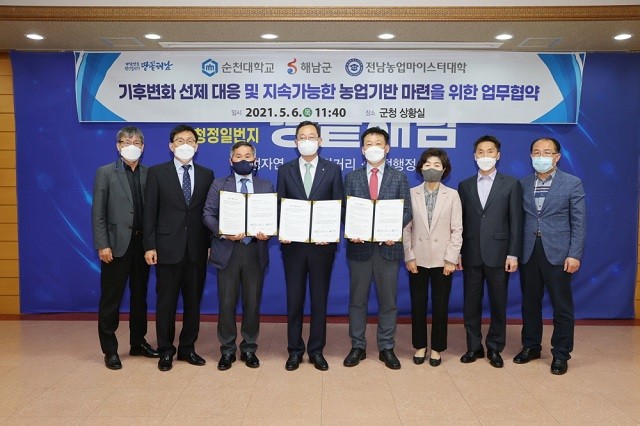 6일 해남군청 상황실에서 진행된 업무 협약식에는 명현관 해남군수, 순천대학교 신동원 생명산업과학대학장, 이기웅 순천대 명예교수, 송경환 전남농업마이스터대학장이 참석해 기후변화 대응 농업연구단지 조성 등 농업역량 강화를 위한 협조체계를 구축하기로 했다.