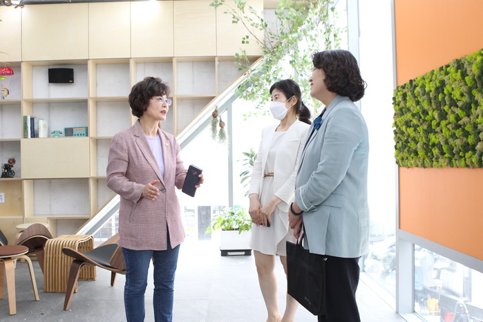 | ▲ 엔젤공방 허브센터를 방문한 박희자 의원(왼쪽)이 준비사항을 점검하고 있다. (사진제공=강동구의회) |