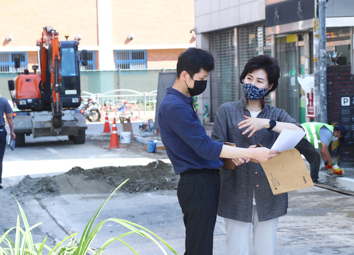 | ▲ 삼전동 58번지 주변 노후도로 포장공사 현장을 방문한 이성자 의원(왼쪽)이 공사 관계자로부터 설명을 듣고 있다. (사진제공=송파구의회) |