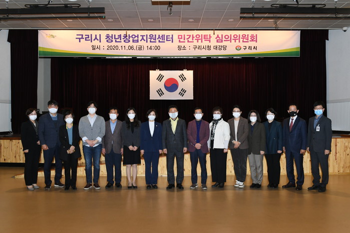 경기 구리시는 최근 구리시 청년창업지원센터 수탁기관 선정을 위한 민간위탁 심의위원회를 개최했다. 오는 2021~2023년 구리시 청년창업지원센터의 운영을 맡아줄 전문적인 수탁기관을 선정하고자 하는 자리로 '광운대학교 산학협력단'이 선정됐다. 사진은 이날 참석한 안승남 시장(가운데)과 관계자들이 기념촬영을 하는 모습. (사진제공=구리시청)