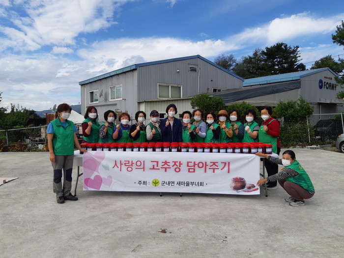 경기 포천시 군내면 새마을부녀회는 최근 지역내 혼자 사는 이웃을 위해 1.6kg 고추장 90통을 직접 만들어 나누는 ‘사랑의 고추장 나누기’ 행사를 진행했다. 사진은 이날 부녀회 회원들이 기념촬영을 하는 모습. (사진제공=포천시청)