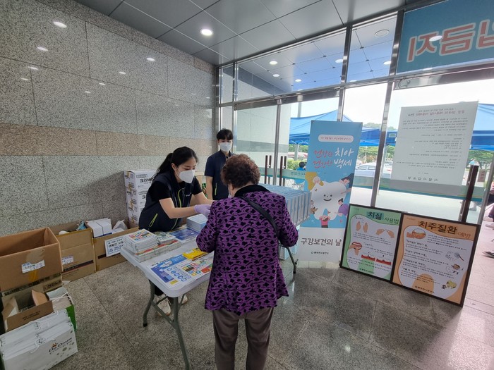 경기 동두천시보건소는 제76회 구강보건의 날을 맞이해 최근 코로나19 백신 예방접종센터에서 백신 접종자를 대상으로 기념 캠페인을 실시했다. 사진은 캠페인 부스에서 올바른 구강환경 관리를 돕기 위해 구강 관련 물품과 교육자료를 배부하고 있는 모습. (사진제공=동두천시청)