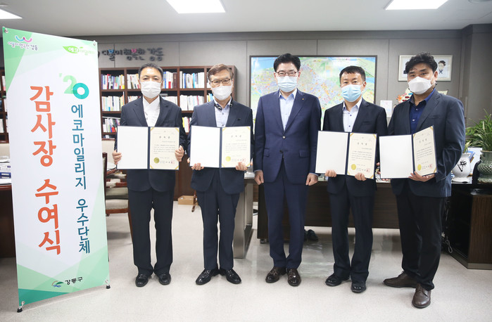 서울 강동구가 최근 구청장 집무실에서 ▲강동경희대학교병원 ▲홈플러스 강동점 ▲둔촌참숯가마목욕탕 ▲서울장신구사업 협동조합 총 4개 단체를 에코마일리지 우수단체로 선정하고 감사장을 수여했다. 사진은 이정훈 구청장(가운데)이 관계자들에게 감사장을 수여한 후 기념촬영을 하고 있는 모습. (사진제공=강동구청)