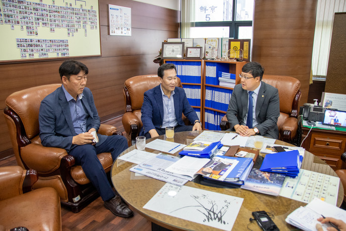 ▲ 강남구의회 이관수 의장(오른쪽)과 삼척시의회 이정훈 의장(가운데)이 양 도시의 교류방안에 대해 논의하고 있다. (사진제공=강남구의회) |