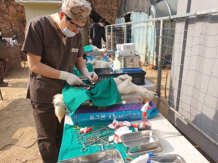경기 여주시는 최근 경기도수의사회 소속 유기견보호봉사단을 지원해 북내유기견보호소(북내면 신접1길 52)에서 동물의료봉사활동을 해 유기견 암컷 중성화수술을 진행했으며 시에서는 100마리분의 광견병 백신 및 주사기 등을 지원했다. 사진은 이날 수의사가 유기견 중성화수술을 하는 모습. (사진제공=여주시청)