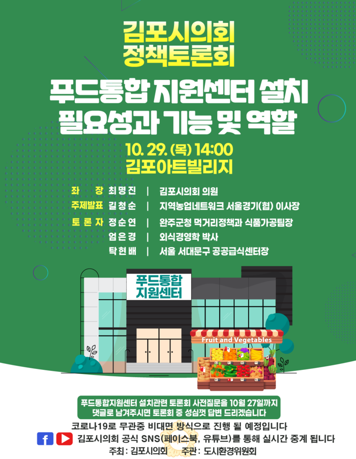 시의회는 이번 토론회를 통해 김포시 푸드통합 지원센터 설립에 대한 전문가를 포함한 각계각층의 의견이 모아질 것으로 기대하고 있다.