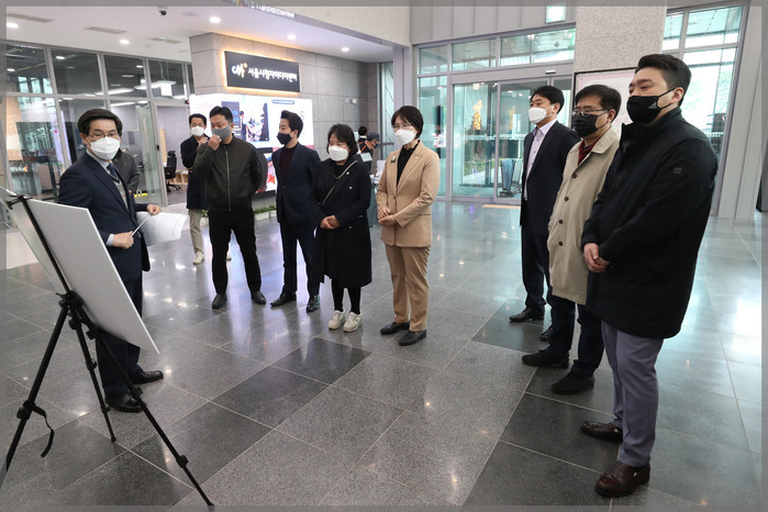 | ▲ 서울 성북 미디어문화마루를 방문한 보건복지위원회 의원들이 관계자로부터 운영 현황을 설명듣고 있는 모습. (사진제공=성북구의회) |