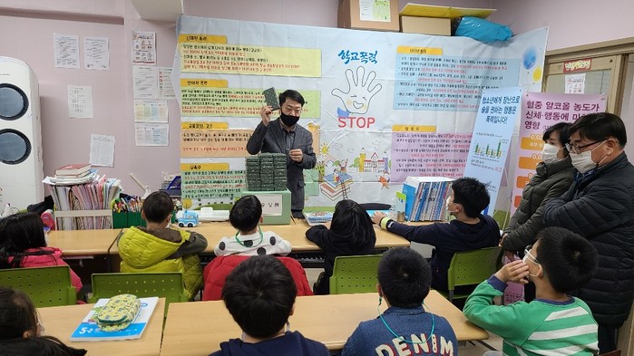 경기 수원시 영통구는 10일 법사랑위원 영통지구협의회 주관으로 학교폭력과 약물 오·남용의 심각성을 알리는 서바이벌 퀴즈쇼를 진행했다. 사진은 지역아동센터 초·중학생 대상으로 학교폭력 및 약물 오·남용의 영향에 대한 퀴즈쇼를 진행하고 있는 모습. (사진제공=영통구청)