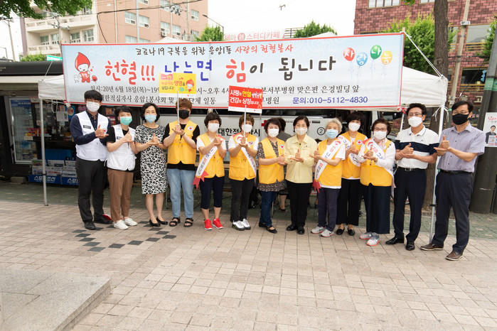 서울 은평구 응암1동은 최근 이틀 동안 서부병원 사거리에서 ‘코로나19 극복을 위한 응암1동 사랑의 헌혈봉사’를 진행했다. 사진은 헌혈봉사에 참여한 관계자들이 기념촬영을 하는 모습.(사진제공=은평구청)