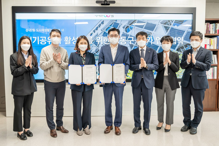 서울 강동구가 지난 19일 (주)쏘카와 함께 성내2동 도시재생활성화지역 주차난 해소와 전기공유차 활성화를 위한 업무협약을 체결했다. 양측은 협약으로 공영주차장 전기공유차 전용공간 제공 등에 상호협력하기로 했다. 사진은 협약식에서 이정훈 구청장(가운데)이 관계자들과 기념촬영을 하는 모습.(사진제공=강동구청)